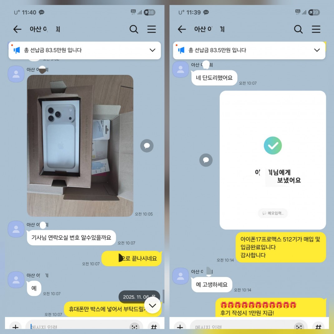 11.05 이*희 고객님 아이폰17프로맥스512GB 매입완료 작성자이*희 등록일 25-11-06 조회53회 이름이*희 본문 비대면으로 선대납진행해드린 고객님이십니다. 미납금 대납 진행 가능합니다~ 언제든지 문의주시면 신속한 상담도와드리겠습니다! 11.07 박*준 고객님 아이폰17프로맥스512GB 매입완료 11.05 한*배 고객님 아이폰17프로맥스256GB 매입완료 수정 삭제 목록 글쓰기