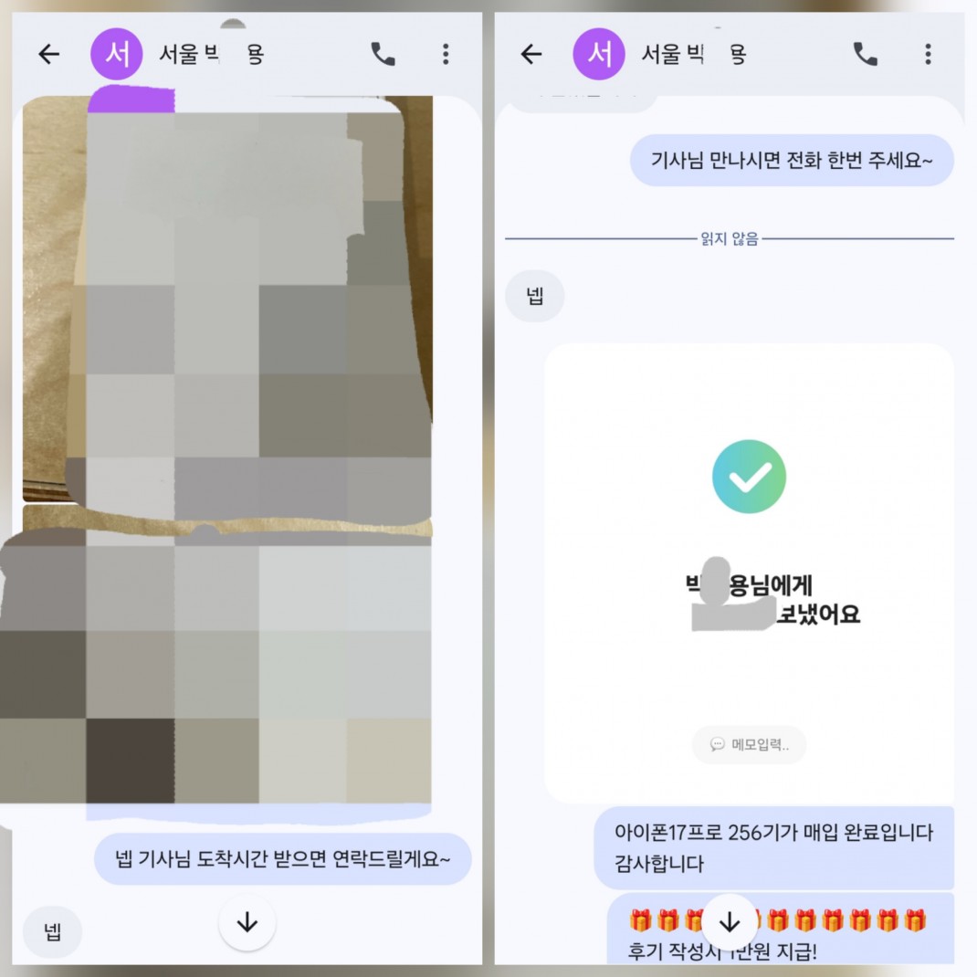 3.25 박*용 고객님 아이폰17프로 256GB 매입완료 작성자박*용 등록일 26-03-27 조회5회 이름박*용 본문 비대면으로 진행해드린 고객님이십니다. 비대면 당일진행.출장매입 모두 가능하십니다. 언제든지 문의주시면 신속한 상담도와드리겠습니다 3.25 손*혁 고객님 아이폰17프로맥스 512GB 매입완료 3.24 이*주 고객님 아이폰17프로맥스 256GB 매입완료 수정 삭제 목록 글쓰기