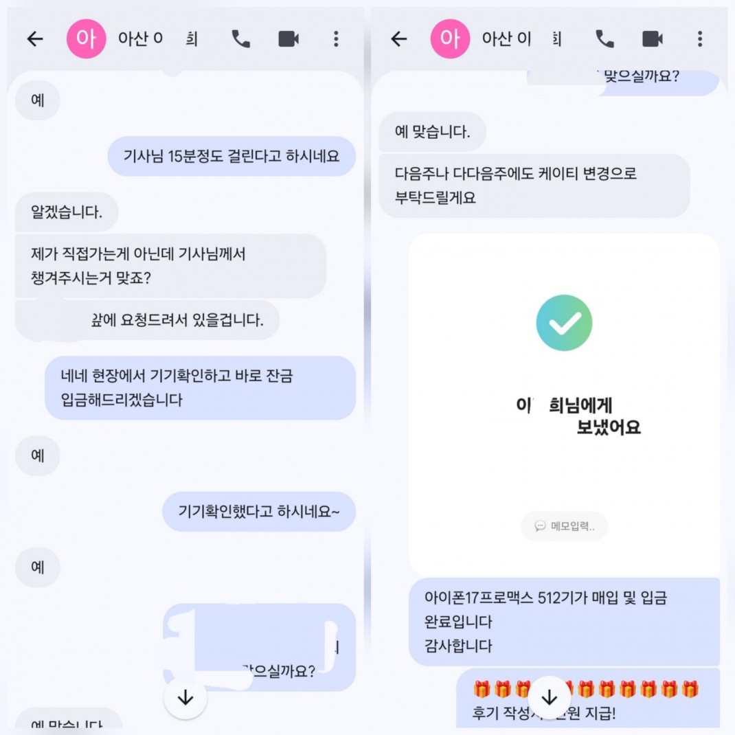 4.14 이*희 고객님 아이폰17프로맥스 512GB 매입완료 작성자이*희 등록일 26-04-15 조회30회 이름이*희 본문 비대면으로 진행해드린 고객님이십니다. 비대면 당일진행.출장매입 모두 가능하십니다. 언제든지 문의주시면 신속한 상담도와드리겠습니다 4.15 김*하 고객님 아이폰17프로맥스 512GB 매입완료 4.14 장*진 고객님 아이폰17프로 256GB 매입완료 수정 삭제 목록 글쓰기