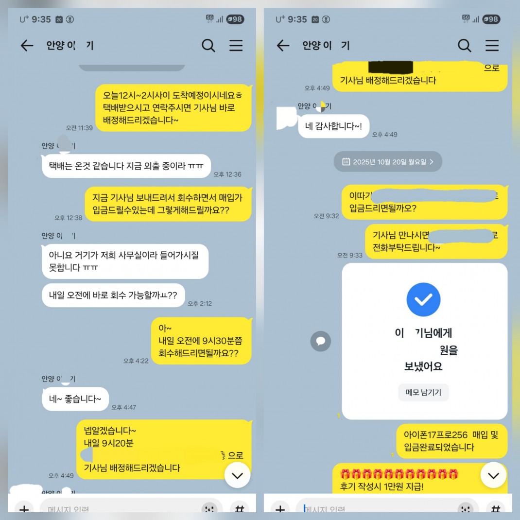 10.20 이*기 고객님 아이폰17프로256GB매입완료 작성자이*기 등록일 25-10-20 조회31회 이름이*기 본문 비대면으로 진행도와드린고객님이십니다. 고객님께서 원하시는 시간에 최대한맞춰 매입진행해드립니딘. 언제든지 문의주시면 신속한 상담도와드리겠습니다 폰테크 아이폰16 프로맥스 이용후기 10.18 박*태 고객님 아이폰17프로256GB 매입완료 수정 삭제 목록 글쓰기