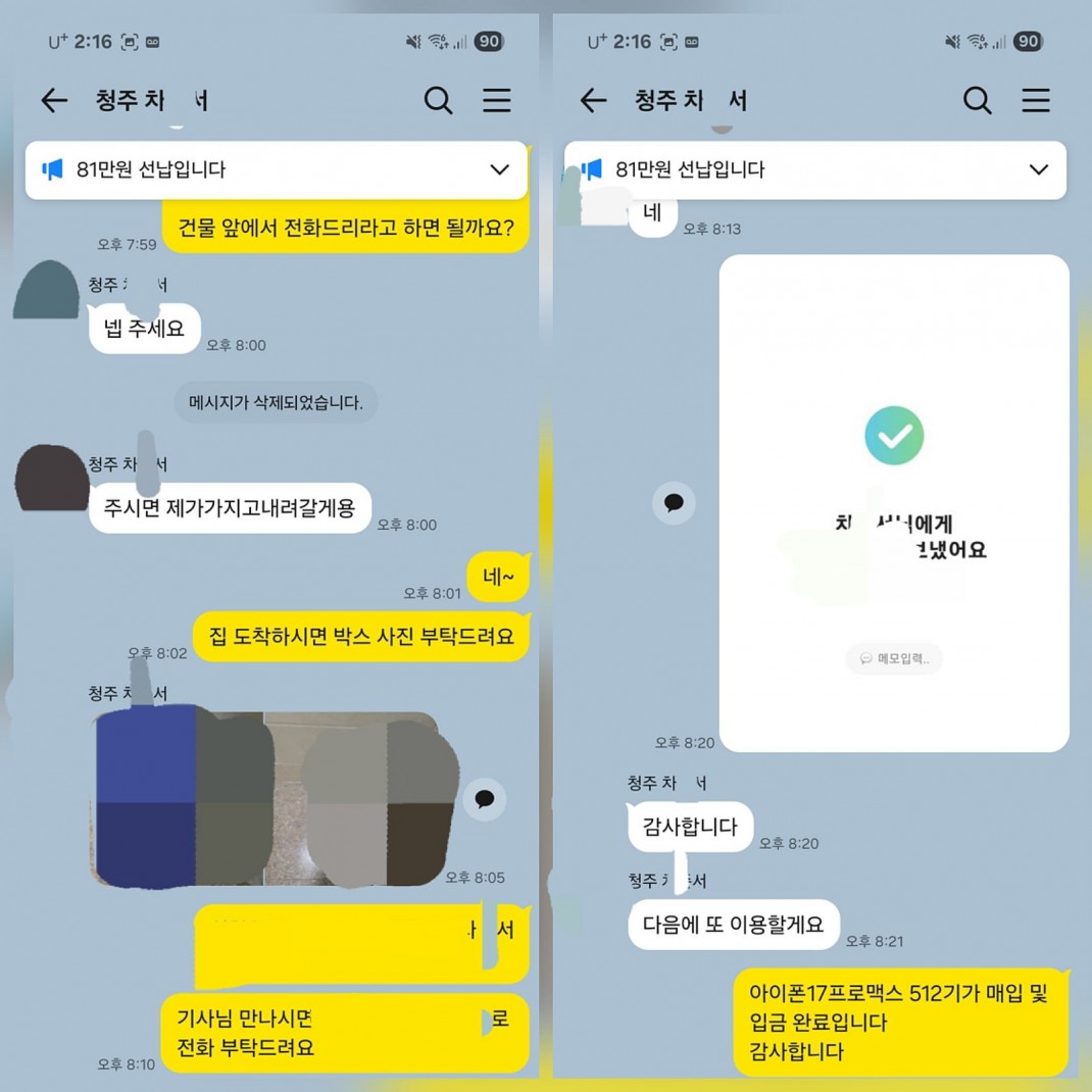 02.13 차*서 고객님 아이폰17프로맥스 512GB 매입완료 작성자차*서 등록일 26-02-27 조회35회 이름차*서 본문 선대납 진행해드린 고객님이십니다. 비대면 당일진행.출장매입 모두 가능하십니다. 언제든지 문의주시면 신속한 상담도와드리겠습니다 02.13 권*원 고객님 아이폰17프로 256GB 매입완료 02.12 이*환 고객님 아이폰17프로맥스 256GB 매입완료 수정 삭제 목록 글쓰기