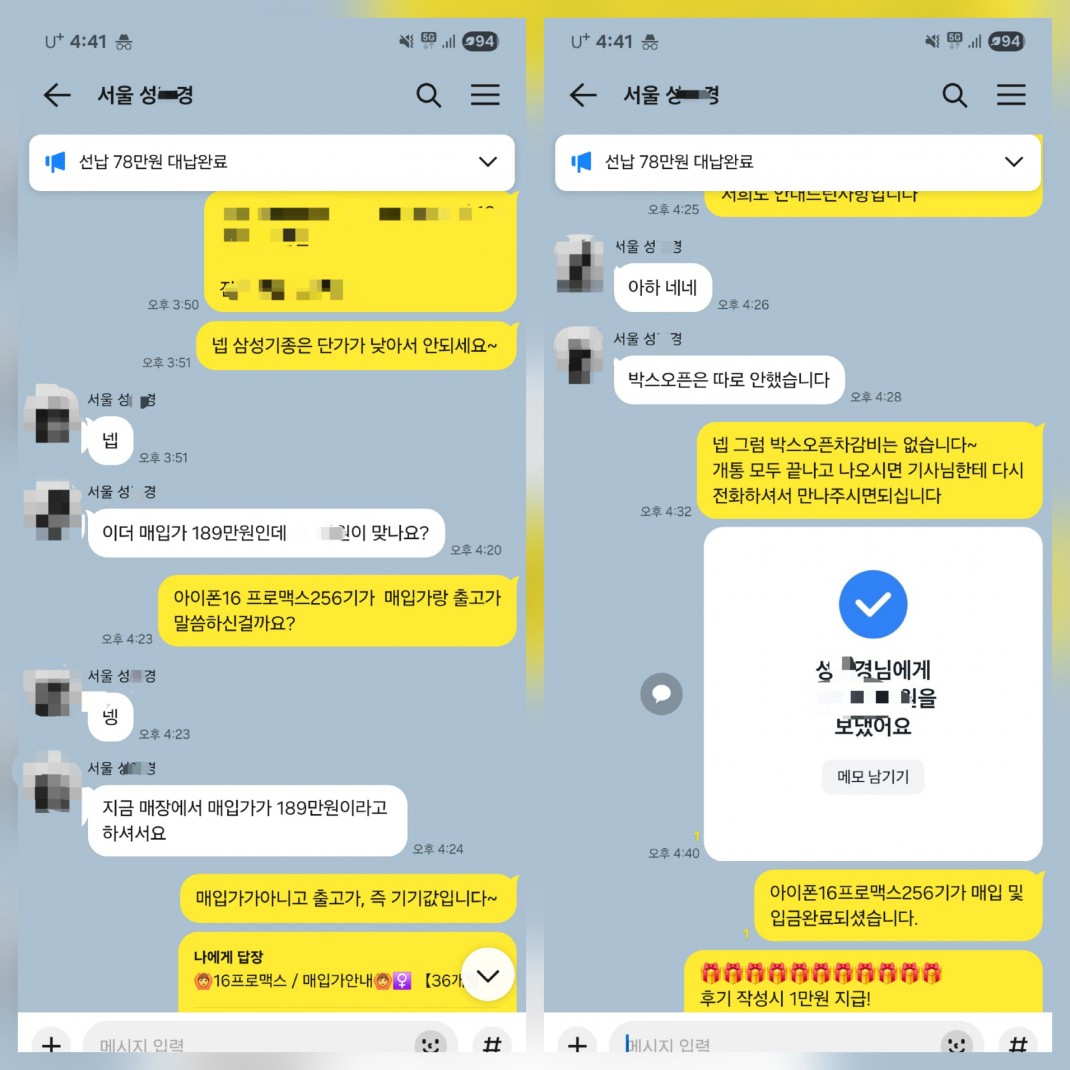 9.20 성*경 고객님 아이폰16프로맥스256GB 매입완료 작성자성*경 등록일 25-09-20 조회109회 이름성*경 본문 기기값 정리가 필요했던건으로 출장담당자를 배정해드려 매입한 고객님이십니다. 아이폰16프로맥스256GB 미개봉으로 매입및 입금완료되었습니다. 9.20 신*준 고객님 S25울트라 256GB 매입완료 9.18 손*아 고객님 아이폰16프로 128GB 매입완료 수정 삭제 목록 글쓰기