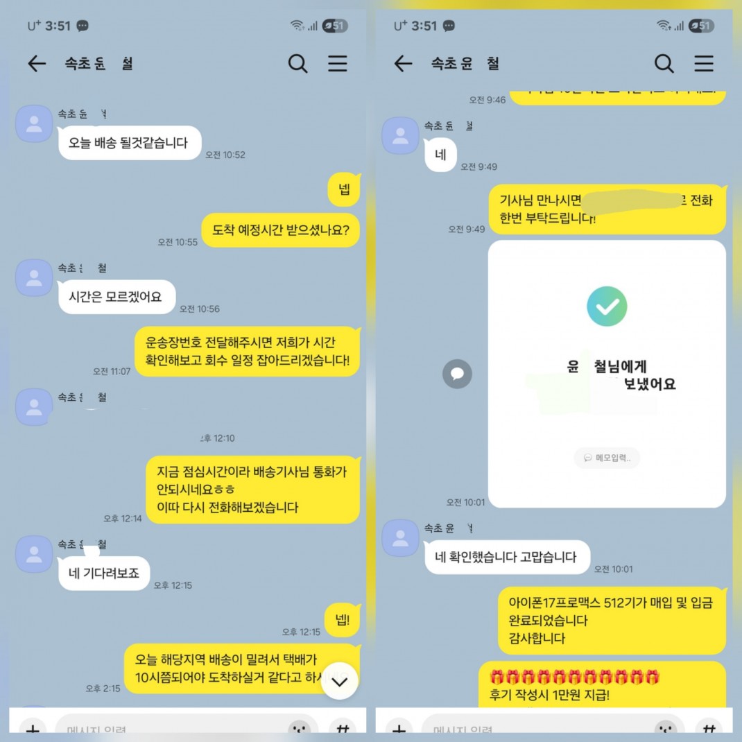 11.13 윤*철 고객님 아이폰17프로맥스512GB 매입완료 작성자윤*철 등록일 25-11-15 조회64회 이름윤*철 본문 비대면으로 진행해드린고객님이십니다. 비대면 당일진행.출장매입 모두 가능하십니다. 언제든지 문의주시면 신속한 상담도와드리겠습니다 11.13 이*준 고객님 아이폰17프로맥스512GB 매입완료 11.13 김*휘 고객님 아이폰17프로맥스1TB 매입완료 수정 삭제 목록 글쓰기
