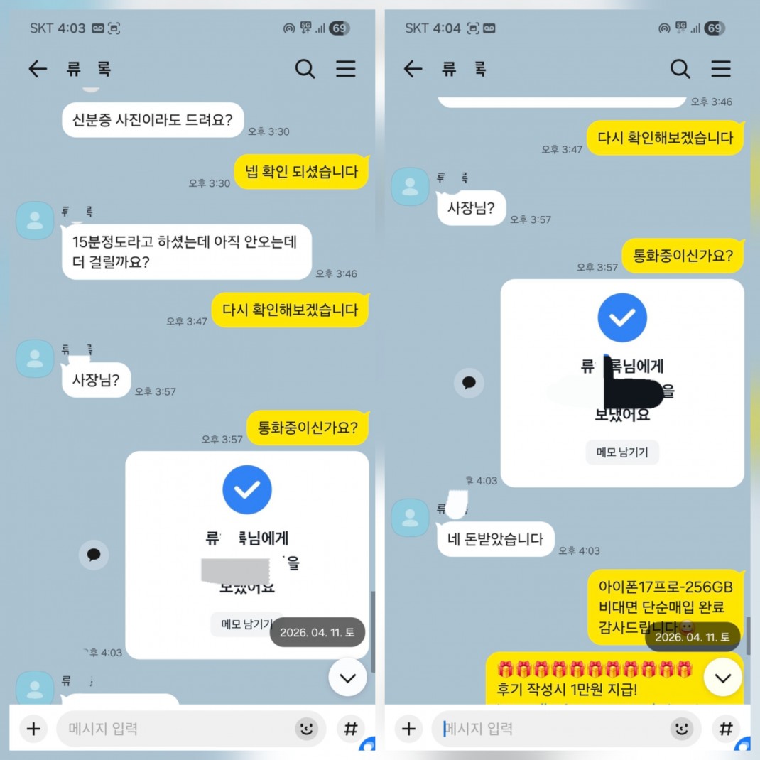 4.11 류*록 고객님 아이폰17프로 256GB 매입완료 작성자류*록 등록일 26-04-15 조회28회 이름류*록 본문 비대면으로 진행해드린 고객님이십니다. 비대면 당일진행.출장매입 모두 가능하십니다. 언제든지 문의주시면 신속한 상담도와드리겠습니다 4.13 김*수 고객님 아이폰17 256GB 매입완료 4.09 김*민 고객님 아이폰17프로맥스 256GB 매입완료 수정 삭제 목록 글쓰기