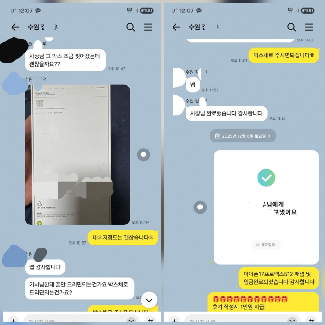 12.05 김*우 고객님 아이폰17프로맥스512GB 매입완료 작성자김*우 등록일 25-12-10 조회17회 이름김*우 본문 비대면으로 진행해드린고객님이십니다. 비대면 당일진행.출장매입 모두 가능하십니다. 언제든지 문의주시면 신속한 상담도와드리겠습니다 12.06 서*진 고객님 신규개통 매입완료 12.05 김*훈 고객님 아이폰17프로맥스512GB 매입완료 수정 삭제 목록 글쓰기
